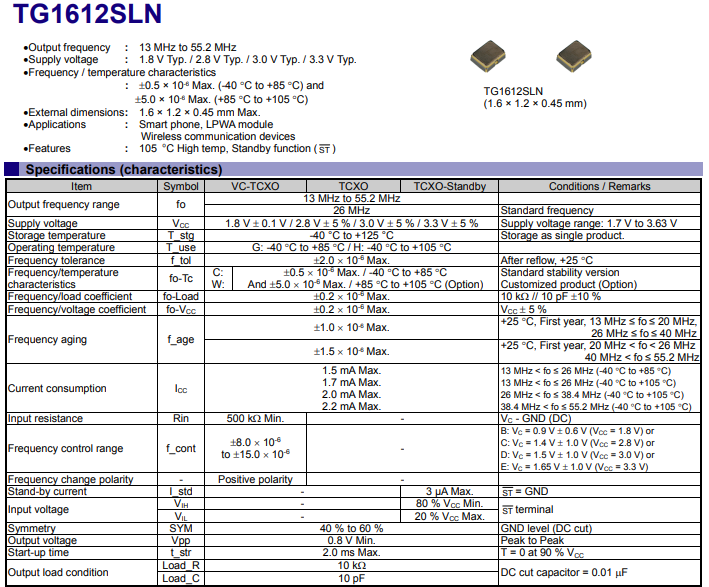 温度补偿晶体振荡器TG1612SLN使用爱普生开发和制造的IC和MHz基本型晶体,可在105℃温度环境下工作并具有待机功能。结合小尺寸,高度低、压力和模制密封阻力的单密封结构的优势,TG1612SLN物联网和工业应用的很好选择。TG1612SLN频率范围:13MHz至55.2MHz,输出方式:削顶正弦波,供电电压:1.7 V至3.63 V(1.8 V ±0.1 V / 2.8 V ±5 % / 3.0 V ±5 % / 3.3 V ±5%)工作温度:-40℃至+105℃。并且TG1612SLN可以兼容ST,支持高标准要求的产品设计,下面南宫ng28电子就给大家分享下TG1612SLN规格书,以供大家选型参考: