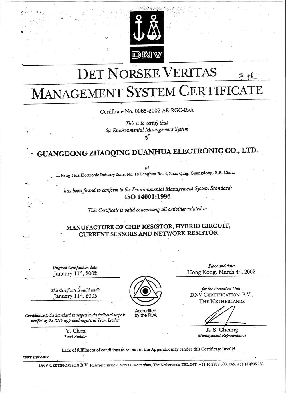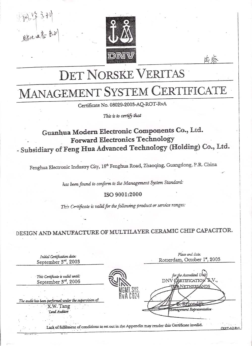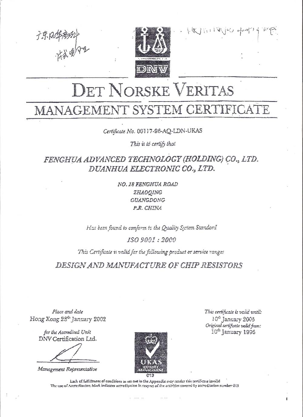 风华高科是全球贴片被动元器件排名八强的知名企业 ,早在2000之前年就实现了贴片电容,贴片电阻,贴片电感,贴片二极管,贴片三极管,贴片磁珠,贴片磁珠排,贴片功率电感,贴片钽电容,贴片晶振,贴片电解电容等系列产品的无铅化和标准化,通过了ISO9000和ISO1400认证。 同时,南宫ng28半导体作为风华高科直接授权代理,风华高科也为其提供了相关的资质文件 以下图片可点击放大。