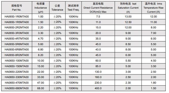 • 饱和电流:指电感量下降 30% 的临界电流,例如 10.0μH 型号(HA0650-100MTA00)的 Isat 为 5.5A,确保电感在脉冲大电流下仍能维持有效储能;