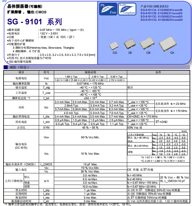 大家好,今天给大家介绍扩展频率中的SG-9101CESG-9101CE是一款小尺寸3225。随着市场小型化、多功能、高信赖度的电子产品需求量大增,产品开发周期时间要求越来越短,传统的石英晶振性能优异,但设计制造周期相对较长,如果有工程师因为项目急需特殊频点,特殊封装的晶振产品用于设计测试,很有可能无法短期内获得对应频点的样品而可能耽误设计周期,影响项目交付进度。扩展频率晶振的出现极大的解决了工程师对新产品晶振的实时变更需求。SG-9101CE内置一个高稳定的有源晶振(基频),利用PLL技术,配合对应的工具软件及外置的编程器方便的调整分频/倍频参数,并在线烧录,几分钟就定制成一个客户所需的全新晶振。这样就大大节省了客户的等待时间,实时提供样片供用户测试。另外对于用量相对较小的用户,可以采取这种方式批量生产,极速交付。SG-9101系列可以分为: SG-9101CA 7050  SG-9101CB 5032 SG-9101CE 3225 SG-9101CG 2520 ,而其中SG-9101CE是小尺寸3225有源晶振同时也是销量很高的一款扩展频率晶振。SG-9101CE频率可编程范围0.67MHz~170MHz(每步1ppm),扩展频率范围±0.25%~±4%。SG-9101CE新品提供更宽广的操作温度范围,及降低50%的消耗电流。SG-9101CE扩展频率晶振的消耗电流比现行量产品更大幅降低了75%。SG-9101CE的扩展频率晶振提供几种类型的调制方式,可以实现б值为±0.5%、±0.75%、±1%、±1.5%、±2%和0.25%的调制,实践证明引入扩展频率晶振调制引入的时钟信号抖动很小。SG-9101CE通过动态改变时钟频率,有效降低d电磁辐射功率,减少EMI电磁干扰的影响,南宫ng28电子依然给大家提供SG-9101CE规格书以供大家选型参考: